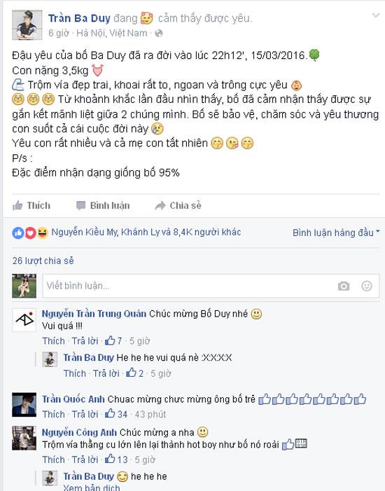 Ba Duy bày tỏ niềm hạnh phúc khi được làm bố: "Đậu yêu của bố Ba Duy đã ra đời vào lúc 22h12', 15/03/2016. Con nặng 3,5kg. Trộm vía đẹp trai, ngoan và trông cực yêu.