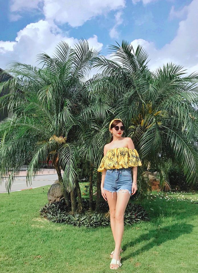 An Japan quyến rũ trong thời trang áo trễ vai kết hợp cùng quần sooc bò.
