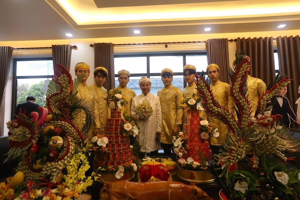 Hữu Công "lọt thỏm" giữa dàn bê tráp nhà trai trong lễ ăn hỏi.