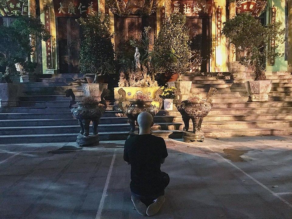 Trung Dũng Sĩ gây bất ngờ khi cạo trọc đầu, quỳ gối thành tâm trước phật.