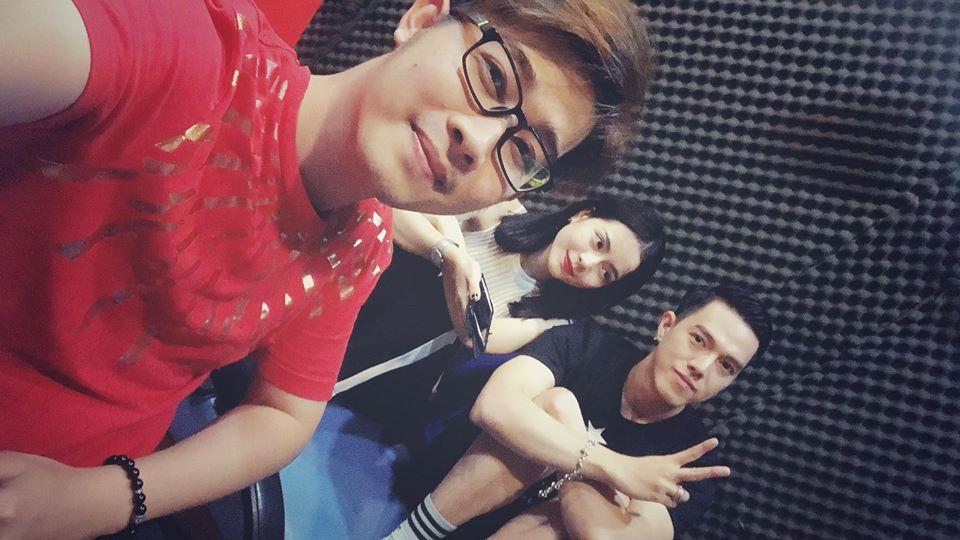 Minh Châu tranh thủ check-in cùng đồng nghiệp khi thu âm bài hát.