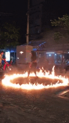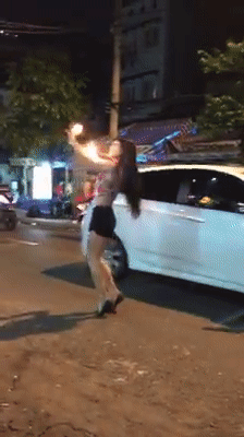 Nếu như cô gái mặc áo hai dây, quần sooc đen chỉ nhảy uốn éo với hai que lửa trên tay thì người bạn "đồng hành" diễn màn múa lửa táo bạo hơn khi ngậm lửa bằng miệng. Đặc biệt, để gây ấn tượng; các cô gái chuyển hướng đổ xăng đốt, tạo thành vòng tròn lửa giữa đường để biểu diễn.