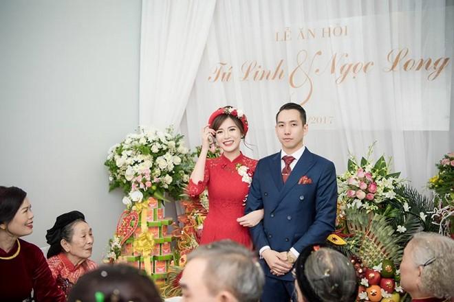 Cô dâu Tú Linh xinh đẹp nổi bật trong chiếc áo dài đỏ. Phong thái đĩnh đạc cùng gương mặt điển trai của chú rể Hoàng Long cũng được dân mạng khen ngợi.