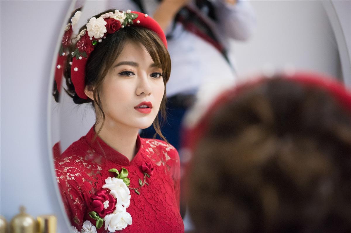Tú Linh xinh đẹp rạng rỡ trong lễ ăn hỏi, cô nàng cũng không quên đùa vui: "Kinh nghiệm cưới hỏi đã đầy mình. Sẵn sàng làm tư vấn viên cho các chị em, nhưng đợi mình cưới xong đã nhá"
