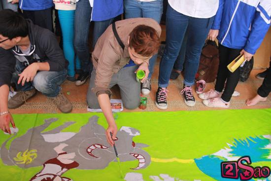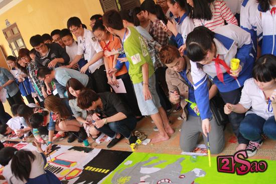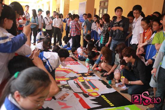 Tâm điểm của sự kiện lần này là các nghệ sĩ, thầy cô giáo và học sinh trường THCS Thành Công cùng nhau vẽ một bức tranh lớn bảo vệ môi trường, cùng làm đồ handmade dưới sự hướng dẫn của nghệ nhân Mẹt quán.