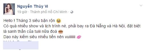 Sau những ồn ào thị phi, thời gian này Thúy Vi đang vui vẻ tận hưởng cuộc sống cùng "hội FA" và chuyên tâm vào công việc người mẫu ảnh. Sóng gió qua đi, "hot girl Cà Mau" đã dần lấy lại được cân bằng trong cuộc sống. Trên trang cá nhân của mình, thời gian gần đây Thúy Vi thường xuyên chia sẻ lịch trình làm việc dày đặc, cô phải di chuyển liên tục từ Đà Nẵng đến Hà Nội.