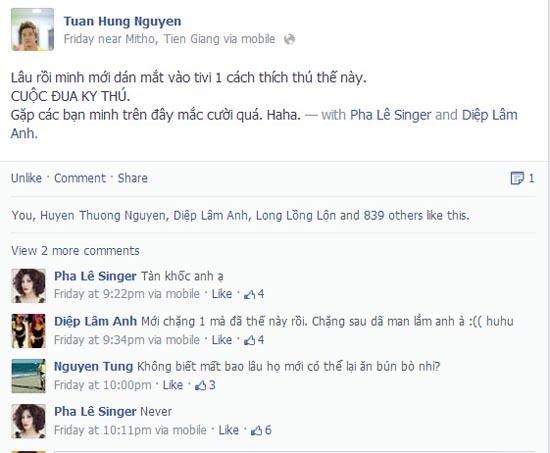 Nam ca sĩ Tuấn Hưng cũng đặc biệt rất yêu thích cuộc đua năm nay, anh từng chia sẻ mình rất ít khi xem các chương trình truyền hình thực tế, nhưng Cuộc đua kỳ thú 2013 là một ngoại lệ. Anh cũng đặc biệt tỏ ra thích thú với đội của hai cô gái Thu Hiền, Diệp Lâm Anh, từng hợp tác với Diệp Lâm Anh trong MV đình đám “Tìm lại bầu trời”, nam ca sĩ cũng chia sẻ việc bất ngờ khi nhìn thấy hình ảnh mạnh mẽ đầy bản lĩnh của cô em gái của mình trong cuộc đua.
