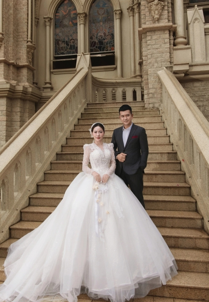 Cô dâu diện đầm cưới lộng lẫy, còn chú rể mặc vest bảnh bao trong ngày trọng đại. Họ có mặt từ sớm ở sảnh cưới đón khách, sau đó vào lễ đường tiến hành các nghi thức rót rượu, cắt bánh.
