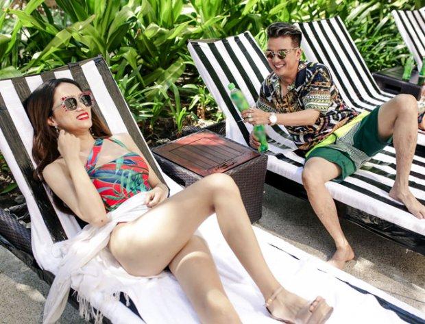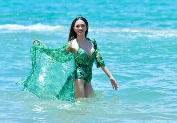Hương Giang khoe hình thể tuyệt mỹ trong trang phục áo tắm bắt mắt nổi bật với họa tiết nhiệt đới. Cô nàng sành điệu khi phối cùng mắt kính và bông tai to bản cũng màu sắc không kém.