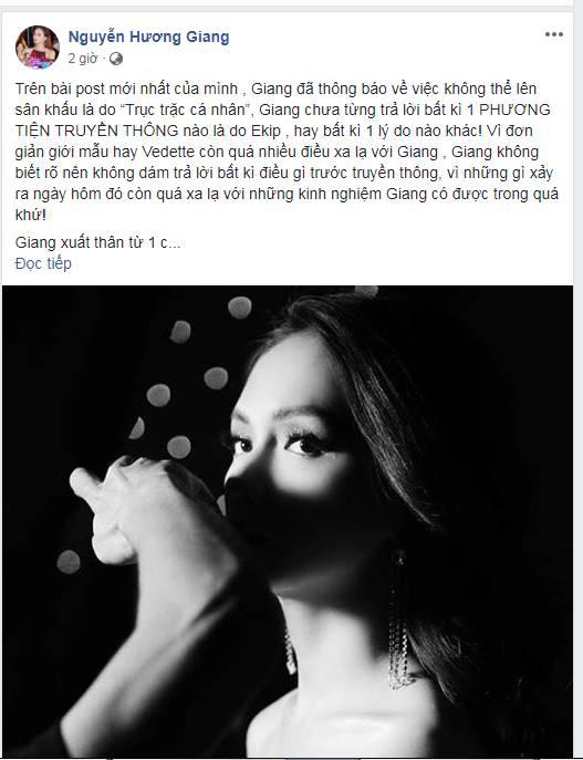 Mặc dù tới khá sớm nhưng cuối cùng, Hương Giang Idol phải ngậm ngùi ra về vì không được nhắc nhở. Những tưởng sự việc sẽ kết thúc trong yên bình khi Hà Duy tiếc nuối về vụ việc. Vậy mà chưa đầy 12h tiếng sau, chủ nhân đêm diễn bất ngờ lên tiếng tố cáo Hương Giang là "ngôi sao mới nổi thiếu ý thức".