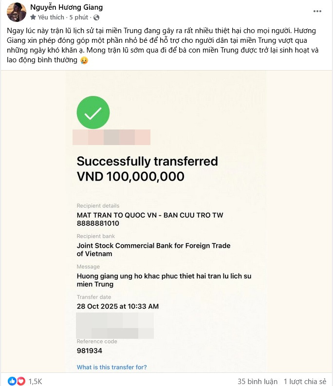 Trên trang cá nhân, người đẹp chuyển giới viết: "Ngay lúc này trận lũ lịch sử tại miền Trung đang gây ra rất nhiều thiệt hại cho mọi người. Hương Giang xin phép đóng góp một phần nhỏ bé để hỗ trợ cho người dân tại miền Trung vượt qua những ngày khó khăn ạ. Mong trận lũ sớm qua đi để bà con miền Trung được trở lại sinh hoạt và lao động bình thường."