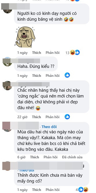 Người xem được phen "dở khóc dở cười". Dưới bài đăng, rất nhiều người để lại bình luận tranh cãi: "Người không có kinh nguyệt dạy người có kinh nguyệt dùng băng vệ sinh", "Thỉnh được kinh chưa mà bán vậy", "Phải dùng mới biết mới quảng cao, hai bà có dùng bao giờ đâu"...