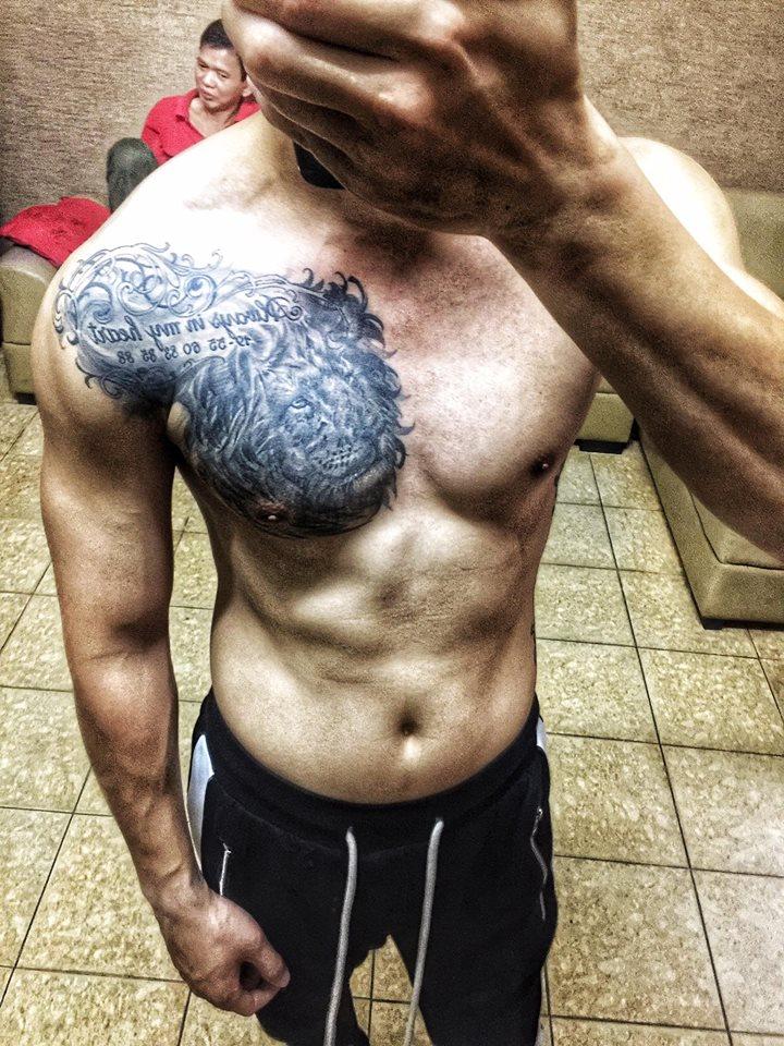 Ông bố một con Mạnh Quân khoe body cùng hình xăm trên ngực phải.