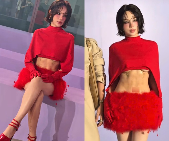 Thiết kế gồm áo croptop và chân váy ngắn giúp mẹ hai con khoe chân ngực lấp ló và vòng eo săn chắc. Đáng chú ý, trong lần xuất hiện này, dân tình đổ dồn sự chú ý vào cơ bụng rõ nét của Huyền Baby. Múi bụng giả trân và có phần nhăn nheo, lồi lõm khiến netizen đặt nghi vấn đây là một sản phẩm thẩm mỹ.