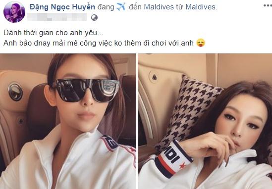 Sau thời gian bận rộn với công việc kinh doanh, mới đây Huyền Baby quyết định dành thời gian đi hâm nóng tình cảm với ông xã. Bà mẹ 2 con cùng doanh nhân Quang Huy chọn đến Maldives. "Dành thời gian cho anh yêu. Anh bảo dạo này mải mê công việc không thèm đi chơi với anh", hot mom hào hứng.