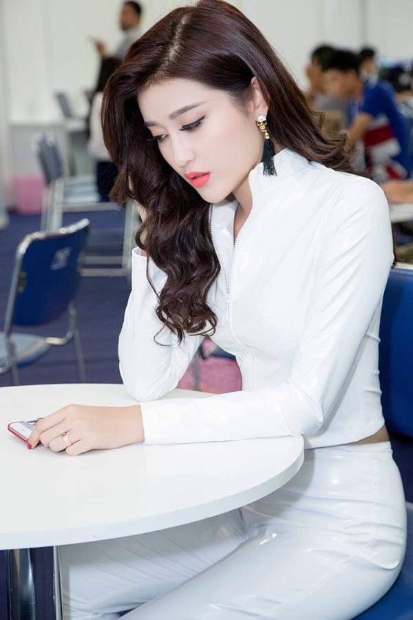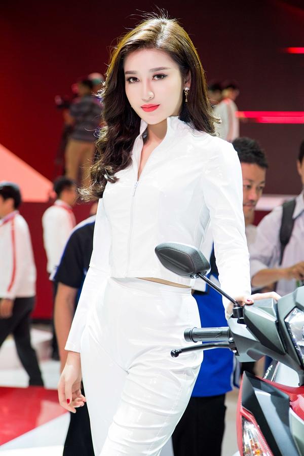 diện bộ jumpsuit màu trắng khá đơn giản nhưng vẫn tôn được vóc dáng thon gọn