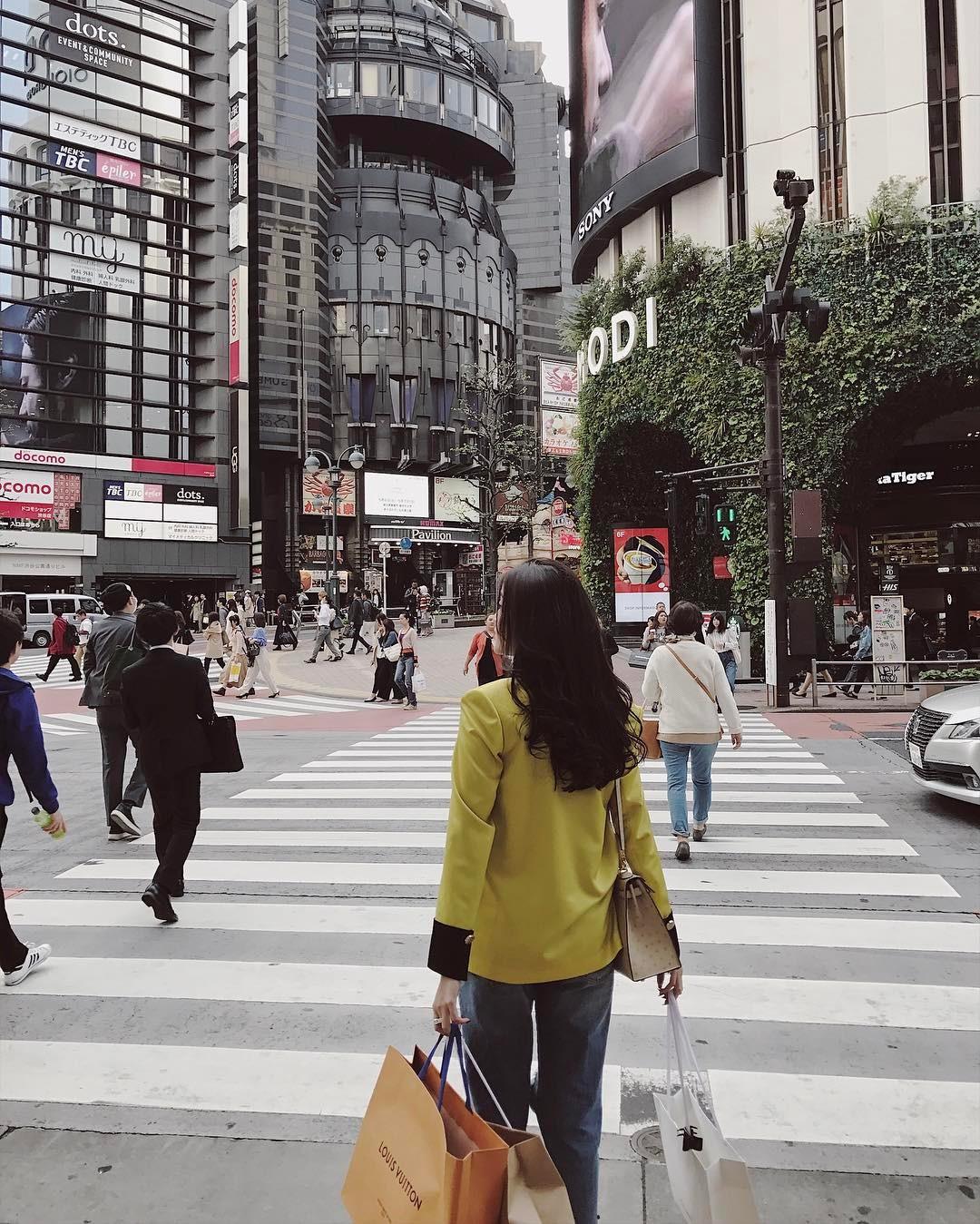 Huyền My "tay xách nách mang" khi mua sắm tại Nhật Bản