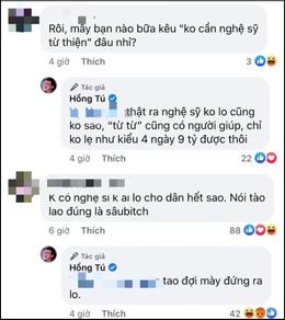 Một tài khoản bình luận: "Rồi, mấy bạn nào bữa kêu 'không cần nghệ sĩ từ thiện' đâu nhỉ?". Hồng Tú đáp lời: "Thật ra nghệ sĩ không lo cũng không sao, 'từ từ' cũng có người giúp, chỉ không lẹ như kiểu 4 ngày 9 tỷ được thôi".