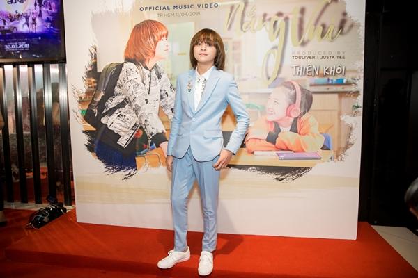 Điều gây bất ngờ nhất chính là hình ảnh trưởng thành của Thiên Khôi tại sự kiện. Diện bộ vest xanh lịch lãm, ấn tượng, gương mặt điển trai kiểu soái ca, nụ cười má lúm tươi tắn... cậu bé được nhận xét có nhiều nét hao hao giống ca sĩ Isaac.