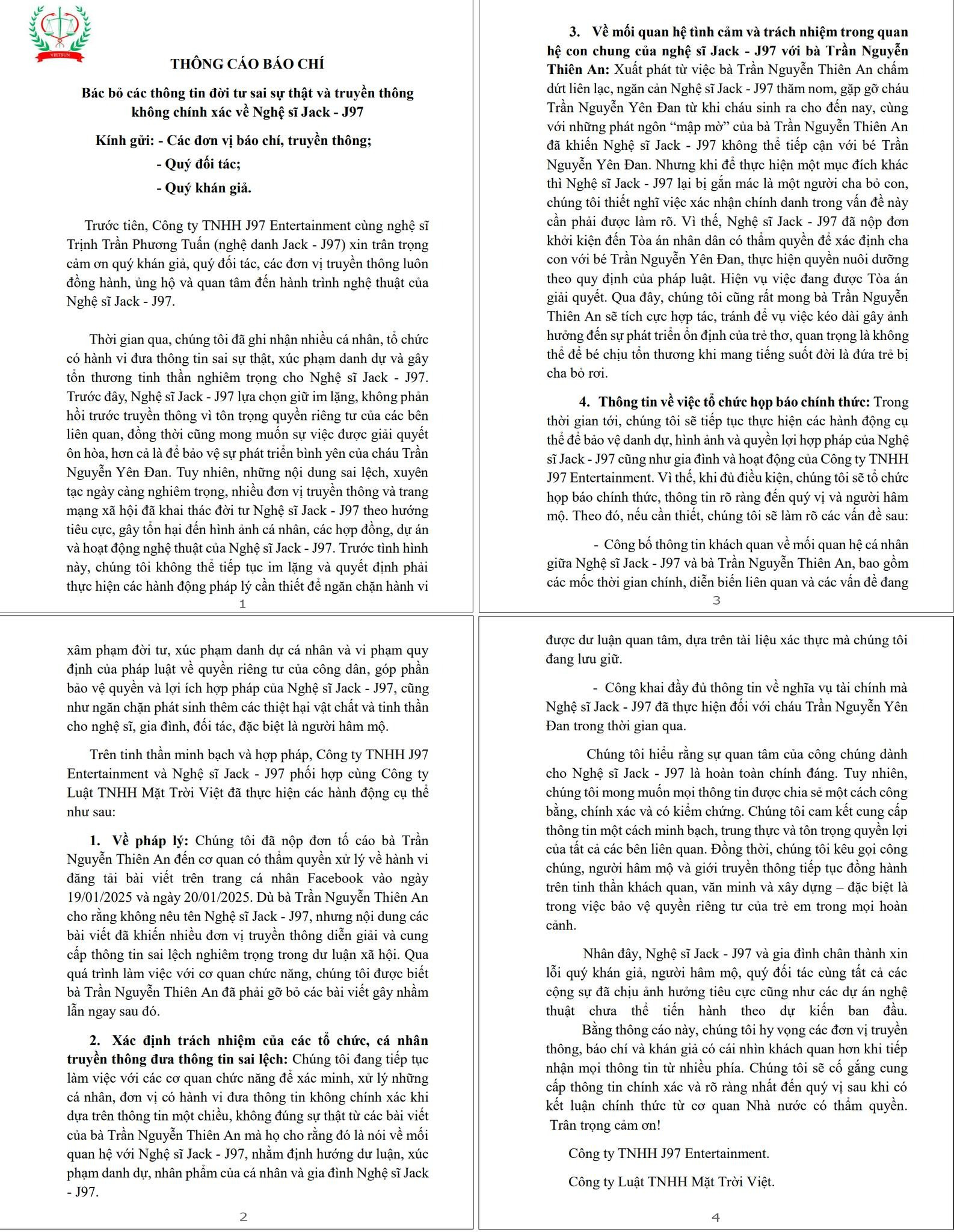 Công ty viết rõ: "Chúng tôi đã nộp đơn tố cáo bà Trần Nguyễn Thiên An đến cơ quan có thẩm quyền để xử lý về hành vi đăng tải bài viết trên trang cá nhân Facebook vào 19/1 và 20/1. Dù bà Trần Nguyễn Thiên An cho rằng không nêu nghệ sĩ Jack - J97, nhưng nội dung bài viết đã khiến nhiều đơn vị truyền thông diễn giải và cung cấp thông tin sai lệch nghiêm trọng trong dư luận xã hội. Qua quá trình làm việc với cơ quan chức năng, chúng tôi biết được bà Trần Nguyễn Thiên An đã phải gỡ bỏ các bài viết gây nhầm lẫn ngay sau đó".