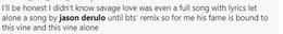 Chủ nhân bản gốc Savage Love, Jason Derulo chỉ vài tiếng trước đã đăng tải một đoạn tiktok ghi lại buổi tiệc chúc mừng No.1 trên BXH danh gia này, đồng thời cũng đánh dấu sự trở lại Billboard Hot 100 của nam ca sĩ sau hơn 11 năm.