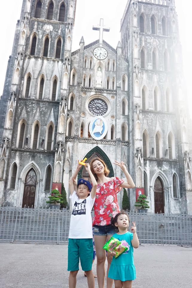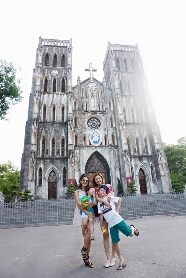 Em gái hoa hậu cùng chị và các cháu hào hứng chụp ảnh tại cổng nhà thờ