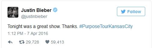 Hôm qua 7/4 (theo giờ địa phương), tour diễn của Justin Bieber đã đến với khán giả của thành phố Kansas, Missouri. Vẫn sử dụng 'chiêu thức cũ', màn mưa giả của Sorry vẫn tạo hiệu ứng sân khấu tốt với những tiếng hò reo rần rần.
