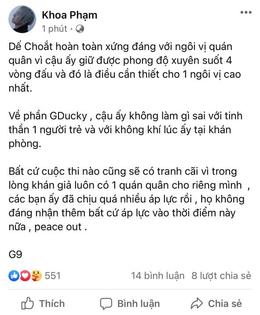 Về phần GDucky, HLV Rap Việt cũng ra sức bênh vực học trò trước những ý kiến trái chiều của cư dân mạng. Theo đó, Karik cho rằng hành động bộc phát của GDucky ngay sau khi biết kết quả chung cuộc là không sai với tinh thần 1 người trẻ cũng như không khí trực tiếp tại khán phòng.