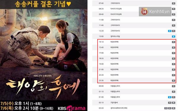 Ngay khi thông tin đám cưới của cặp đôi Song Song được tung ra, trang web của đài KBS đã thông báo chiếu lại liên tiếp 16 tập Hậu Duệ Mặt Trời trong hai ngày mùng 5 và 6/7/2017 trên KBS Drama - một kênh chiếu phim của đài. Đây được xem như một chương trình "khẩn cấp" và nhà đài chấp nhận hủy bỏ các chương trình trùng giờ trước đó để chiếu lại hành trình yêu nhau trên màn ảnh của Song Song cho khán giả thưởng thức.