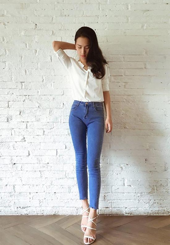trắng, quần jeans cạp cao, xăng đan thanh mảnh.