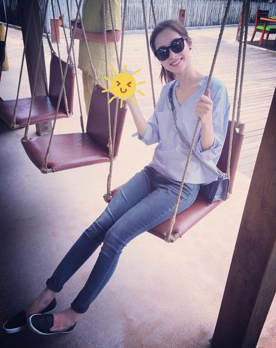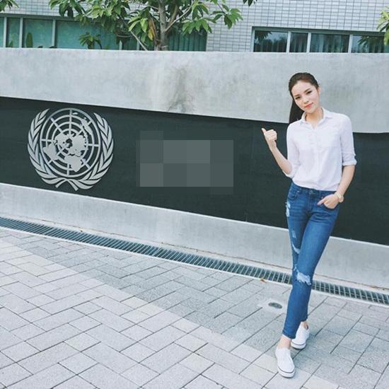 Hoa hậu Kỳ Duyên khỏe khoắn và năng động với áo sơ mi trắng, quần jeans xanh và giày