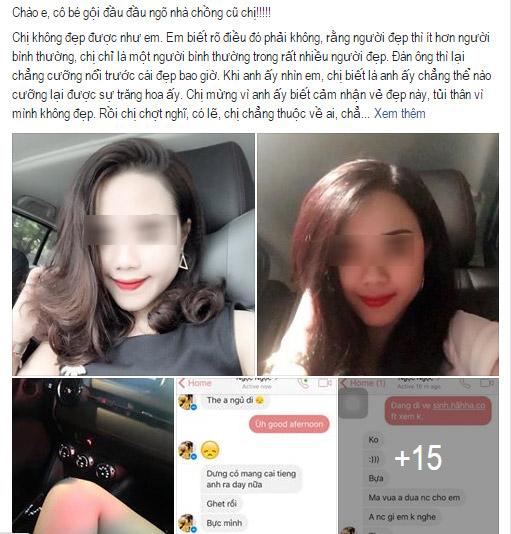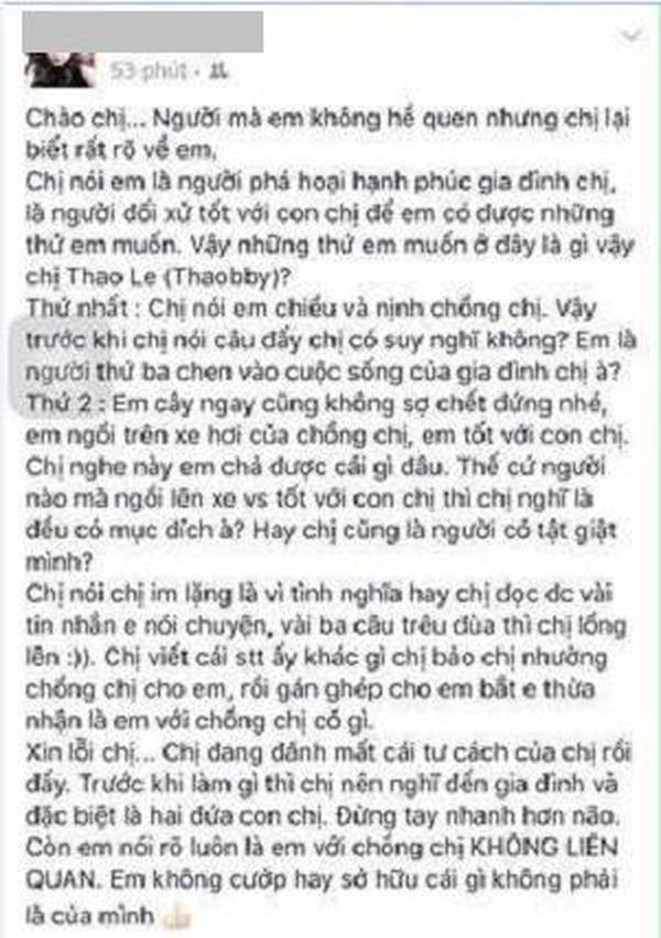 “Em không cần phải block facebook chị đâu N ạ. Sống thật với mình đi em. Cây ngay sao phải sợ chết đứng? Em xem em ngồi trên xe hơi chồng chị! Em tốt với con chị... Để e có được những gì em muốn rồi. Em đã vừa lòng chưa??? Chị biết hết tất cả, có điều chị im lặng vì tình nghĩa bấy lâu! Chồng chị, người tình trong mộng của em ấy, anh vẫn mong chị quay về hàng ngày đây. Nhưng chị biết vị trí của mình ở đâu. Chị biết cái gì thuộc về mình có duyên thì sở hữu còn đâu chẳng bận lòng tranh cướp với ai. Em hãy thương yêu thứ mà chị muốn thương yêu nhưng không thể, thay chị và giúp chị nhé em”.