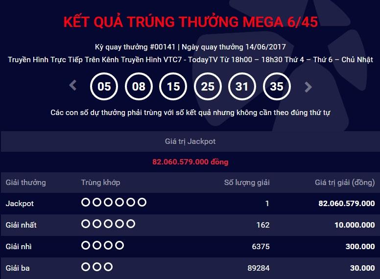 Dãy số may mắn trong kỳ quay thưởng của Vietlott lần này là: 05 – 08 – 15 - 25 – 31 - 35. Với việc đã tìm ra chủ nhân của giải Jackpot trị giá 82.060.579.000 đồng, giá trị giải thưởng Jackpot trong kỳ quay thưởng thứ 142 của xổ số Mega 6/45 sẽ quay về mốc 12 tỷ đồng.