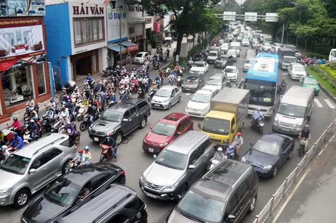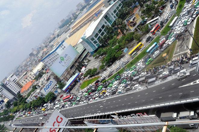 Hàng ngàn phương tiện xếp hàng dài từ đường Trường Sơn kéo dài đến cầu vượt thép Lăng Cha Cả.