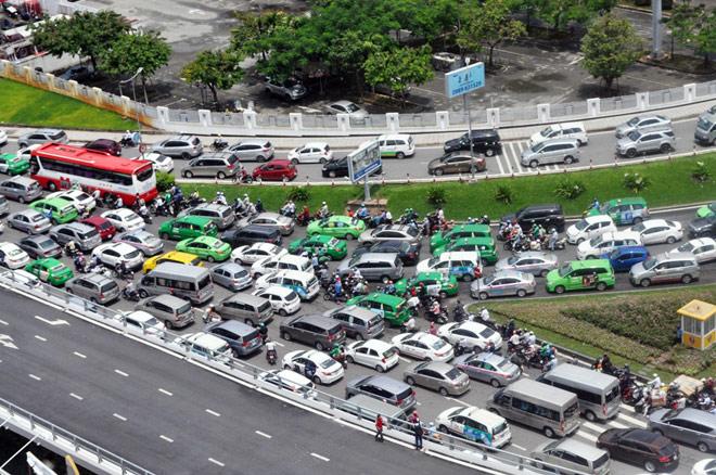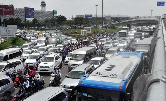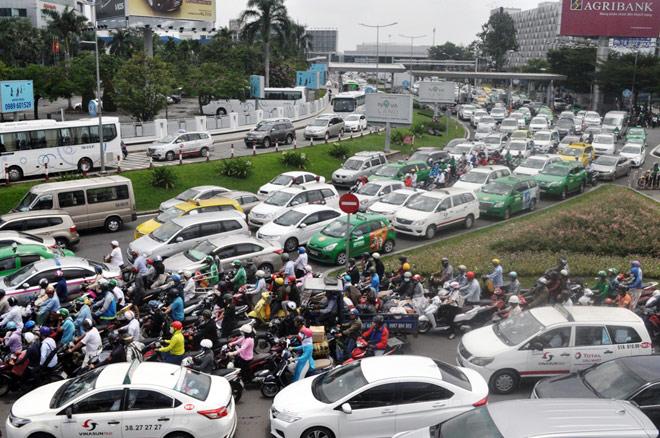 Ở hướng ga quốc nội và ga quốc tế, dòng phương tiện đông nghẹt tràn ra đường Trường Sơn.