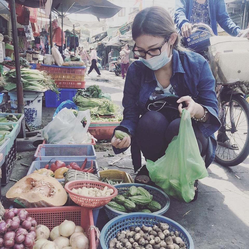 Emmy Nguyễn bịt mặt kín mít đi chợ ngày cuối năm.