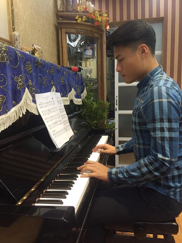 Trong khi đó Mạc Hồng Quân đăng ảnh ngồi học đánh đàn.