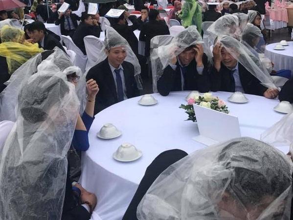 Điều đáng nói ở đây khi thời tiết ngoài trời đang mưa, khách mời đồng loạt đội mưa quẩy nhiệt tình mừng ngày vui của cô dâu chú rể. Chứng kiến cảnh tượng người nào người nấy mặt mũi, quần áo lấm lem bùn đất khiến cư dân mạng không khỏi bật cười.