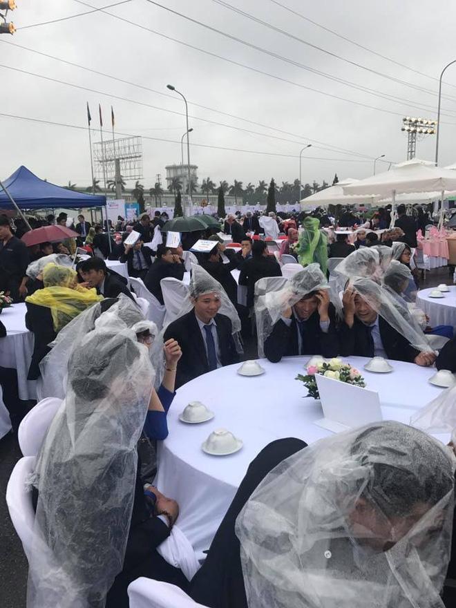 Dàn khách mời đội mưa dự tiệc đám cưới ở Hưng Yên.