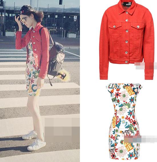 Bộ đồ bao gồm váy họa tiết và áo khoác denim màu cam đều