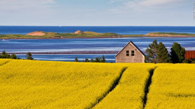 Cảnh đồng hoa rực rỡ nằm sát bờ biển trên đảo Prince Edward ở Canada.