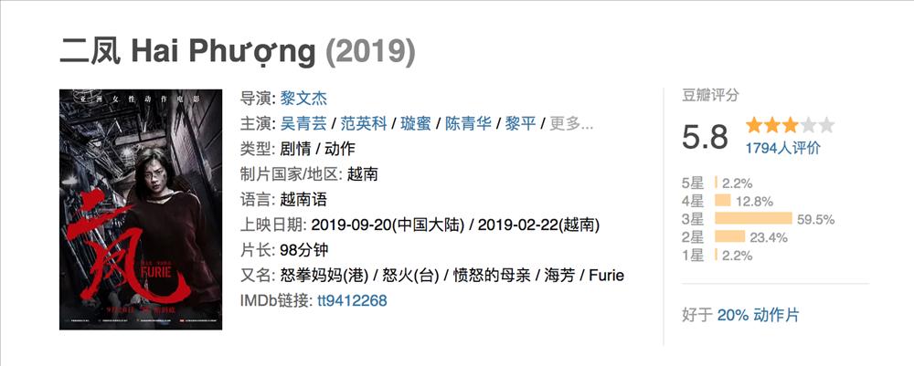 Trên trang chuyên đánh giá phim của Trung Quốc là Douban thì bộ phim được khán giả chấm 5.8 điểm, số người chấm 3 sao chiếm nhiều nhất với 59,5%. Với con số này có thể thấy Hai Phượng được khán giả Trung nhận định đây là một bộ phim điện ảnh với chất lượng trên trung bình.