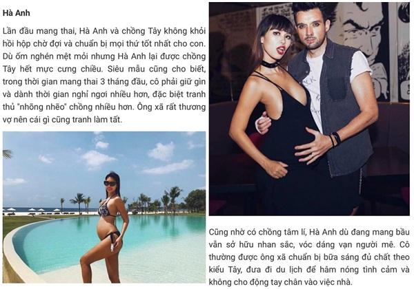 Cách đây ít giờ, siêu mẫu Hà Anh đăng tải ảnh chụp màn hình một bài viết về cô trên trang cá nhân. Theo đó, nội dung của bài viết cho rằng chân dài Hà thành được chồng hết mực cưng chiều trong quá trình mang thai.