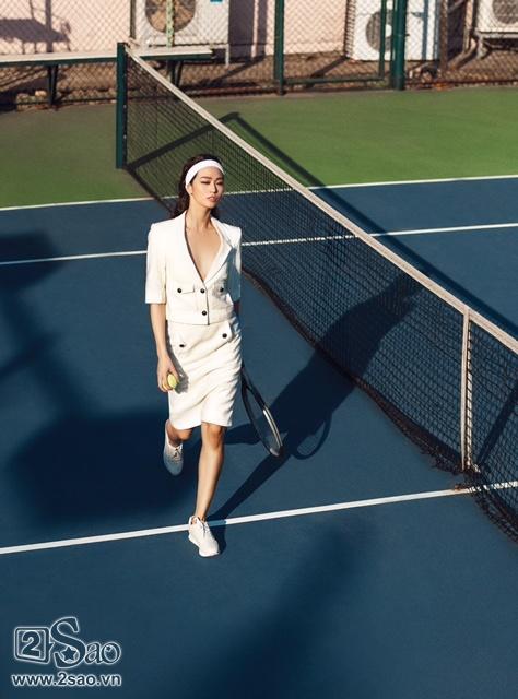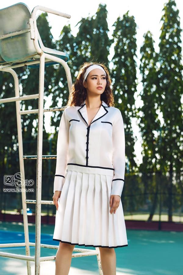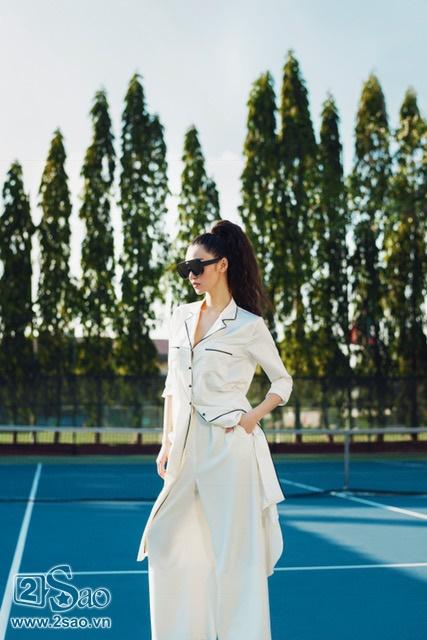 Cầm vợt tennis đầy khỏe khoắn trên sân tập, Khánh My không ngại khoe dáng kiêu hãnh trên giày cao gót. Người đẹp diện những kiểu trang phục với thiết kế thanh lịch như sơ mi cổ pyjama, váy pyjama xếp ly cách điệu, áo trễ vai, quần ống loe..., chất liệu mỏng nhẹ và bay bổng, tạo nên hình ảnh đối lập thú vị.