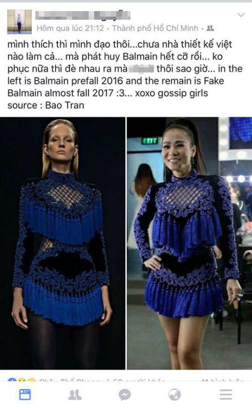 Thế nhưng, khi xuất hiện tại Việt Nam Idol 2016, nữ ca sĩ bị cho là đã diện chiếc váy khá giống với thiết kế của nhà mốt nổi tiếng Balmain. Hiện tại cô cùng ekip vẫn chưa hề lên tiếng về những tin đồn này.
