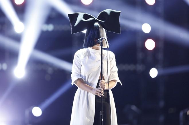 Sia biểu diễn trên sân khấu với mái tóc giả đặc trưng che kín gương mặt. Ảnh: The Sun