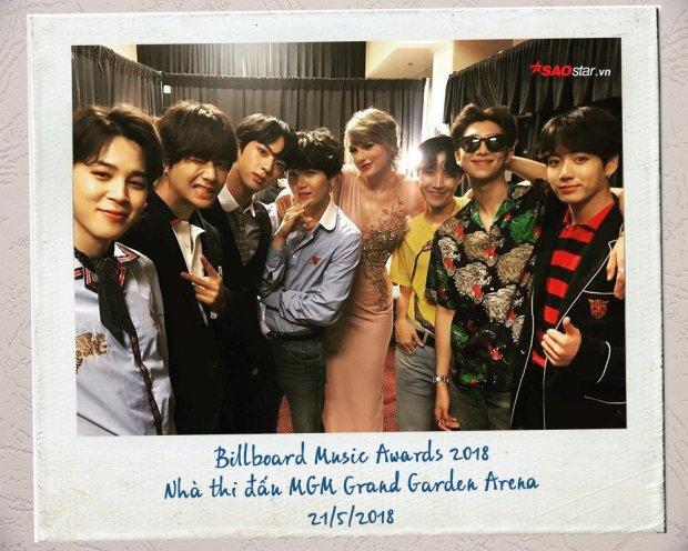 Bên cạnh đó còn là 2 bức ảnh để đời của 7 chàng trai nhà Big Hit: bức ảnh đầu tiên là khoảnh khắc vô cùng “nhắng nhít” cạnh Taylor Swift - người suýt nữa bị đại diện Kpop sang bằng kỉ lục trên YouTube - được chính giọng ca Look What You Made Me Do đăng tải lên tất cả các kênh truyền thông, thậm chí cô nàng Taylor còn thích thú đăng hẳn tấm hình trên lên story Instagram nữa.