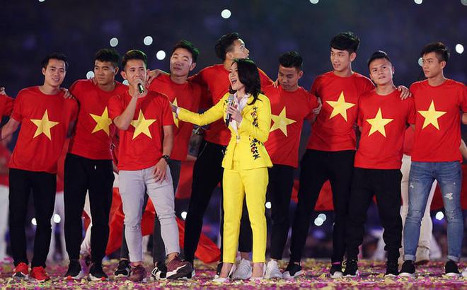 Đứng sau Mỹ Tâm là cả dàn "cực phẩm" 23 Việt Nam: Trọng Đại cao 1m84, Bùi Tiến Dũng cao 1m81, Lương Xuân Trường cao 1m78, Đức Chinh cao 1m72. May mà người song ca "Niềm tin chiến thắng" với Mỹ Tâm là Hồng Duy chỉ có 1m68 và Văn Thanh cao 1m62 làm nền nên tổng thể còn đỡ chênh lệch nhiều.