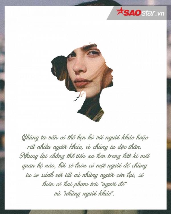 Chúng ta vẫn có thể hẹn hò với người khác hoặc rất nhiều người khác, vì chúng ta độc thân. Nhưng lại chẳng thể tiến xa hơn trong bất kì mối quan hệ nào, bởi sẽ luôn có một người để chúng ta so sánh với tất cả những người còn lại, sẽ luôn có hai phạm trù “người đó” và “những người khác”. Đối với sự quan tâm của “người đó”, chúng ta không có cách gì để né tránh, để chống cự, thậm chí vẫn chờ đợi nhận được sự quan tâm. Bởi đó là người mà chúng ta thích.