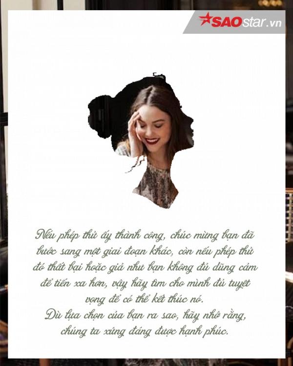 Còn nếu phép thử đó thất bại hoặc giả như bạn không đủ dũng cảm để tiến xa hơn, vậy hãy tìm cho mình đủ tuyệt vọng để có thể kết thúc nó. Chỉ khi bạn đủ tuyệt vọng, bạn mới có thể dứt lòng chấm dứt đoạn tình cảm đầy mệt mỏi này, và đón chào những đoạn tình cảm mới.
